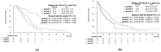 According to a nationwide follow-up survey of primary liver cancer in Japan by the Liver Cancer Study Group of Japan [25], the median OS of patients with Child–Pugh grade A who received systemic therapy between 2012 and 2013 was 12.6 months. The median OS of patients in 2009–2013 (period 1) in our study was 14.3 months (Figure 4b). However, some discrepancies were found among the BCLC-C patients. A nationwide report showed that the median OS of patients with naïve HCC having macrovascular invasion or metastasis was 7.72 months, whereas the median OS of patients treated between 2009 and 2013 in our study was 13.1 months (Figure 5b). As reported by Kobayashi et al., the median OS among BCLC-C patients in 2009–2012 was 8.7 months, and in 2013–2016, this was 10.7 months [15]. These differences could be due to several factors such as hepatic reserve, the degree of vascular invasion, naïve or recurrent treatment, or selection bias. The notable prognosis in period 1 could be one of the reasons why no significant differences in OS were observed among patients with BCLC-C. Moreover, 48% of BCLC-C patients in period 3 were undergoing treatment at the time of reporting this study, and the observation period was short. Therefore, further investigation of OS in period 3 is needed.