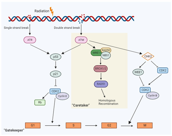 In response to DNA damage response from radiation, a cascade of events along the “gatekeep” and “caretaker” pathways are activated that ultimately leads to cell cycle arrest or DNA repair.