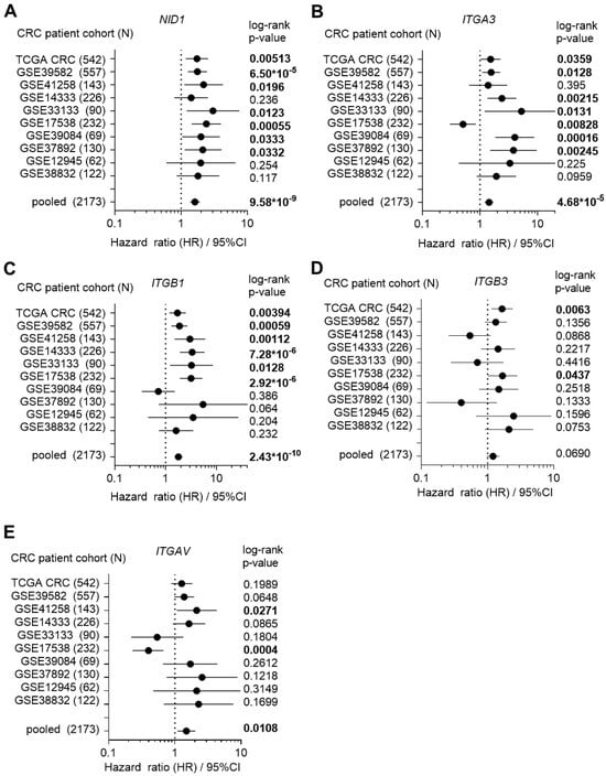 High expression of NID1 and its receptors is associated with poor prognosis and advanced stage in CRC. (A–E) Forest plot showing Hazard ratios for relapse-free survival of indicated mRNAs by comparing patients with high versus low expression of indicated mRNAs in indicated CRC patient cohorts. Dots represent Hazard ratios and horizontal lines show 95% CI. p-values were calculated using the log-rank method. Significant p-values are highlighted in bold.