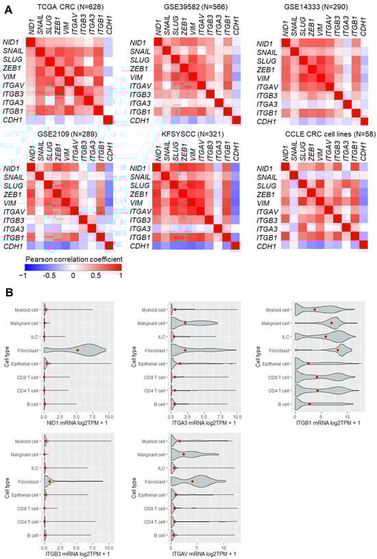 To investigate the role of NID1 and its receptors in CRC, we first analyzed the associations of NID1, ITGA3, ITGB1, ITGB3, and ITGAV mRNA expression with clinico-pathological parameters in publicly available CRC patient cohorts. High expression of NID1 and its receptors was significantly and consistently associated with poor survival in the majority of 10 CRC patient cohorts (Figure 1A–E). Furthermore, the expression of NID1 and its receptors progressively increased from stage 1 to stage 4 primary tumors in the majority of 10 CRC patient cohorts (Figure 2A). Next, we analyzed the expression of NID1 and its receptors in different consensus molecular subtypes (CMS) of CRC [20]. The expression of NID1, ITGB1, ITGB3, and ITGAV was highest in the CMS4 subtype, which represents CRCs with mesenchymal features, metastasis, and poorest prognoses (Figure 2B). The expression of NID1 correlated positively with the expression of ITGAV, ITGB3, and ITGB1, as well as with the mesenchymal-state-associated SNAIL, SLUG, ZEB1, and VIM mRNAs in expression profiles of five CRC patient cohorts, the CCLE CRC cell line panel, and in normal sigmoid and transverse colon tissue (Figure 3A and Figure S1). In contrast, NID1 and the integrins correlated negatively with the expression of the epithelial-state-associated gene CDH1 (Figure 3A and Figure S1). Finally, analysis of single-cell RNA-Seq data from primary colon tumors [23] showed that NID1 and ITGB3 mRNAs are predominantly expressed in fibroblasts, ITGAV and ITGA3 are expressed in fibroblasts and cancer cells, and ITGB1 is expressed in all cell types within colon tumors (Figure 3B). Altogether, these results show that elevated expression of NID1 and its receptors is associated with poor prognosis, advanced stage, and mesenchymal tumor features, suggesting that NID1/integrin signaling may play an important role in CRC progression.