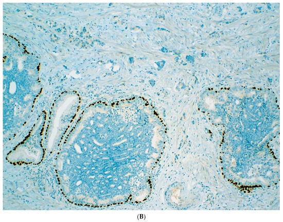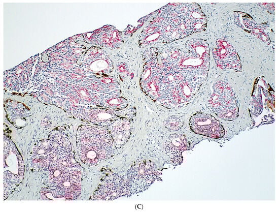 Isolated IDC-P without concomitant prostate cancer in a prostate biopsy (A,B). The IDC-P glands have residual basal cells positive for basal cell markers (brown stains) and are also positive for AMACR (red stain) (C). Isolated IDC-P is associated with unsampled GG ≥ 2 PCa in the majority of cases, although no invasive or only GG1 PCa is found in subsequent RPs in approximately 10% of cases.