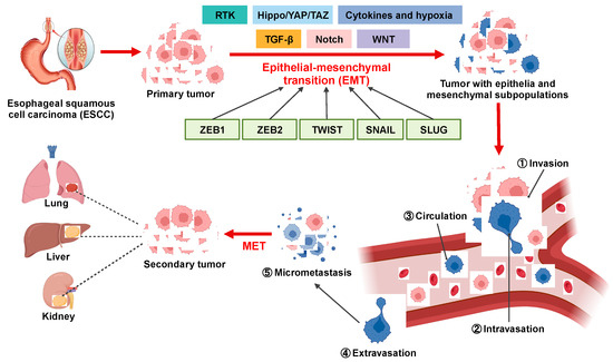 Overview of the involvement of EMT in ESCC metastatic cascade. EMT confers migratory and invasive potential to ESCC cells, enabling them to (1) locally invade the basement membrane, (2) intravasate into lymphatics and blood vessels, (3) circulate through lymphatics and blood vessels to distant tissues and organs, and (4) extravasate from lymphatics and blood vessels to (5) form micrometastases and secondary tumors.