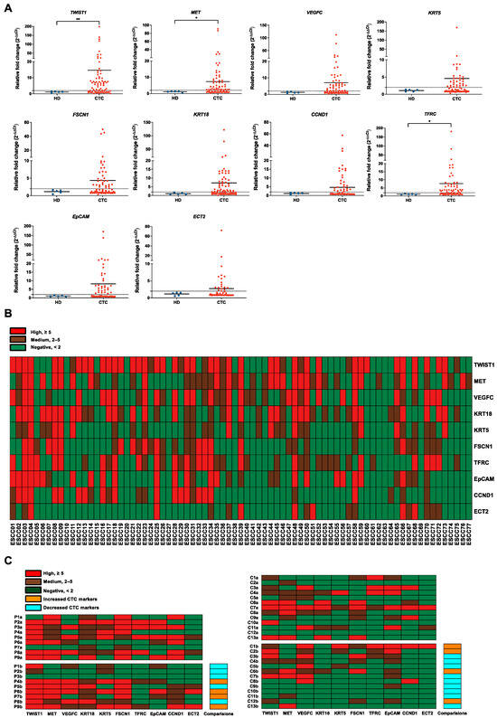Evaluation of gene panels for characterizing CTCs in patients with ESCC. (A) Gene expression correction using RT-qPCR for leukocyte contamination in CTC samples. The data were visualized as a scatter plot with the median, and the line represents the reference normal fold change value. HDs (n = 5), CTC (n = 77). ** p-value < 0.01, * p-value < 0.05. (B) Heatmap of transcript levels of 10 CTC markers in 77 ESCC samples by RT-qPCR. Control, HDs. (C) Heatmap of 10 CTC markers in 22 pairs of ESCC samples between different clinical time points using RT-qPCR. P, palliative treatment, n = 9; C, curative treatment, n = 13; a, baseline; b, pre-III or one-month post-surgery. Control, HDs.
