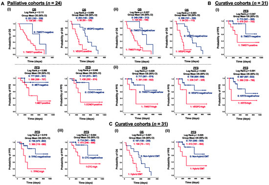 Correlation of CTC marker expression at baseline with PFS or OS in ESCC subgroups. (A) Kaplan–Meier survival analysis of OS with CTC gene expression at baseline in palliative cohorts (n = 24). Gene stratification into two groups, (i) 0, 1: negative and positive gene expression; (ii) 0, 1: negative/low and high gene expression. (B) Kaplan–Meier survival analysis of PFS with CTC gene expression at baseline in curative cohorts (n = 31). Gene stratification into two groups, (i) 0, 1: negative and positive gene expression; (ii) 0, 1: negative/low and high gene expression; (iii) 0, 1: CTC-negative/low and CTC-high. (C) (i) Kaplan–Meier survival analysis of PFS with hybrid EMT CTC at baseline in palliative cohorts (n = 24), (ii) Kaplan–Meier survival analysis of OS with hybrid EMT CTC at baseline in curative cohorts (n = 31). Gene stratification into two groups 0, 1: non-hybrid and hybrid EMT CTC.