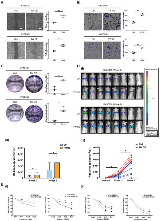 Functional role of TWIST1 in ESCC metastatic progression. (A) A wound healing assay was performed to determine the cell migration ability of TWIST1-overexpressing cells. Magnification: 4×. Scale bars: 200 μm. Data show means ± SD of three independent experiments. Ctrl: control; TW OE: TWIST1 overexpression. ** p-value < 0.01. (B) A Matrigel-coated transwell assay was performed to determine the cell invasion ability of TWIST1-overexpressing cells. Magnification: 10×. Scale bars: 200 μm. Data show means ± SD of three independent experiments. ** p-value < 0.01. (C) A colony formation assay was performed to determine the cell clonogenicity of TWIST1-overexpressing cells. Data show means ± SD of three independent experiments. ** p-value < 0.01. (D) Bioluminescence signals were used to evaluate the in vivo metastasis of TWIST1-overexpressing cells. (i) All images were taken under 1 min exposure and adjusted to the same scale. (ii) Metastasis quantification. * p-value < 0.05. (iii) Speed of metastasis of TWIST1-overexpressing cells. * p-value < 0.05. (E) An MTT assay was performed to determine the cell viability of cells treated with (i) 20 μM cisplatin and (ii) 10 μM cisplatin for 24, 48, 72 h. Data show the means ± SD of three independent experiments. TW KD: TWIST1 knockdown. ** p-value < 0.01, * p-value < 0.05.