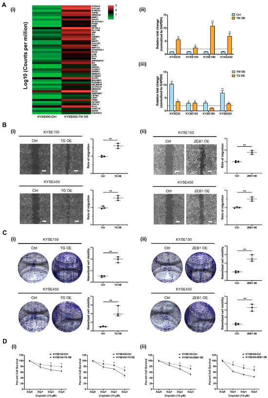 Functional role of TWIST1-TGFBI-ZEB1 signaling in ESCC. (A) TGFBI-ZEB1 is regulated by TWIST1 in ESCC, as indicated by RNA-seq and RT-qPCR. (i) RNA-seq heat map of top 50 upregulated genes upon TWIST1 overexpression in KYSE450 cells. (ii) Transcript level of TGFBI downstream of TWIST1 was quantified using RT-qPCR. Error bars represent standard error mean. ** p-value < 0.01, * p-value < 0.05. (iii) overexpression. ** p-value < 0.01, * p-value < 0.05. (B) Wound healing assay was performed to determine the cell migration ability of (i) TGFBI-overexpressing cells and (ii) ZEB1-overexpressing cells. Magnification: 4×. Scale bars: 200 μm. Data show means ± SD of three independent experiments. ** p-value < 0.01. (C) Colony formation assay was performed to determine the cell clonogenicity of (i) TGFBI-overexpressing cells and (ii) ZEB1-overexpressing cells. Data show means ± SD of three independent experiments. ** p-value < 0.01. (D) MTT assay was performed to determine cell viability of (i) TGFBI-overexpressing cells and (ii) ZEB1-overexpressing cells treated with 10 μM cisplatin for 24, 48, 72 h. Data show the means ± SD of three independent experiments. * p-value < 0.05.