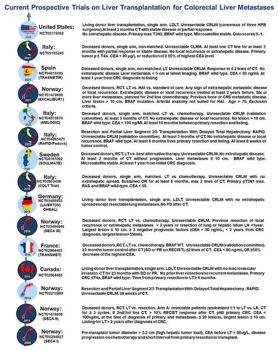 Colorectal cancer (CRC) is the third most common cancer worldwide, and fourth in terms of mortality. Metastatic variations in the disease are most commonly found in the liver and tend to affect males at a higher global incidence [115,116]. Treatment options for CRC patients with affected organs like the liver have good survival outcomes, as reported with curative hepatectomy used to treat liver oligometastases. However, often, surgical resection for hepatic ailments, dependent on the disease criteria, is explored as an option. In colorectal liver metastasis (CRLM), the treatment options include R0 resection, which is the resection process of sparing at least two adjacent liver segments having independent inflow, outflow, and biliary drainage. The remaining liver, following resection, should not be less than 20–30% of the total natural liver volume in normal and cirrhotic patients. In the presence of CRC patients with unresectable liver metastases, the initial experience of LT was not encouraging, with a 5-year OS rate lower than 20% [111]. The general consensus to the discussion of poor outcomes in patient cohorts are attributed to the absence of suitable selection criteria and the lack of appropriate neoadjuvant and adjuvant therapies. However, more studies have been conducted for better evidence (Figure 2) [117]. In the past, beginning with SECA 1, in 2008, the criteria of pre-transplant tumor diameter at > 5.5 cm and the potential for high hepatic tumor load, as well as carcinoembryonic antigen (CEA) levels before LT at >80 ug/L. A secondary study and expansion of data and results took place in the SECA 2 study in 2011, a multi-arm trial, which created the standardized Oslo score for colorectal liver metastasis patients. Later studies (Figure 2) developed the CRLM criteria by progressively building from aspects of precedence, with SECA 3, COLT, SOULMATE, MELODIC, and EXACALIBUR1 reporting comparative trials following LT versus chemotherapy, standard of care, or best alternative therapy. A recent publication from the US in 2022, a single-arm trial using living donor liver transplantation (LDLT) with the necessary criteria including computed tomography (CT), showed stable or partial response for 3 months, unresectable diagnosis, and no evidence of extrahepatic disease (Figure 2). Additional studies have also been conducted to primarily improve outcomes and evaluate optimal dosing and downstaging for CRLM patients.