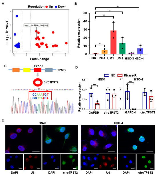 Expression and characterization of circTPST2 in HNSCC. (A) circRNA microarray analysis was used to detect nine tumor tissues, and the volcano plot shows the differential expression of circRNAs between human HNSCC tissues and adjacent normal tissues. (B) qRT–PCR was used to determine the expression level of circTPST2 in normal HOK cells and five HNSCC cell lines (HN31, UM1, UM2, HSC-3, and HSC-4) with the Mann–Whitney test for statistical analysis. (C) circTPST2 was primarily transcribed from exon 3 of TPST2, which was measured by qRT–PCR and validated by Sanger sequencing amplified with divergent primers. (D) qRT–PCR was used to determine the abundance of circTPST2 and linear TPST2 mRNA in HN31 and HSC-4 cells treated with RNase R. (E) RNA FISH showed that circTPST2 was located in the nucleus and cytoplasm compared with the internal reference U6 in HN31 and HSC-4 cells. The nuclei were stained with DAPI (scale bars, 100 μm). Values are expressed as the means ± SDssss; * p < 0.05, ** p < 0.01, and *** p < 0.001.