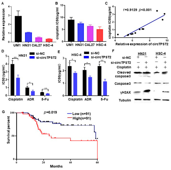 circTPST2 inhibited cisplatin sensitivity in vitro. (A) qRT–PCR was used to detect the expression level of circTPST2 in different HNSCC cell lines (UM1, HN31, CAL27, and HSC-4). (B) A CCK8 assay was used to test the IC50 of cisplatin in four HNSCC cell lines. (C) The expression of circTPST2 was positively correlated with the IC50 of HNSCC cells (r = 0.9129, p < 0.001). (D,E) CCK-8 assay showed that the IC50 of cisplatin, ADR, or 5-Fu in HN31 and HSC-4 cells was significantly reduced after silencing circTPST2. (F) Western blot analysis showed that the protein expression of cleaved caspase 3 and γH2AX was evidently increased in two HNSCC cell lines treated with cisplatin for 48 h and transfected with si-circTPST2. The uncropped bolts are shown in Supplementary Materials. (G) Kaplan–Meier analysis showed that circTPST2 was negatively correlated with the overall survival rate of HNSCC patients with chemotherapy in the TCGA database (high n = 91, low n = 91). Values are expressed as the means ± SDssss; * p < 0.05, and ** p < 0.01.