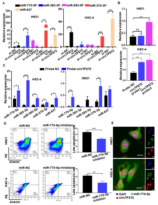CircTPST2 could act as a sponge of miR-770-5p in HNSCC. (A) qRT–PCR assays showed the expression of 5 different types of miRNAs after the transfection of si-NC and si-circTPST2. (B) RNA pulldown assays showed that biotinylated circTSPT2 probe 2 could effectively pull down circTSPT2 in both HNSCC cell lines. (C) RNA pulldown assays showed that biotinylated circTSPT2 probe 2 could effectively pull down miR-770-5p and miR-370-3p in both HNSCC cell lines. (D) A cell flow assay was applied to test the number of late apoptotic cell deaths after the inhibition of miR-770-5p in HNSCC cells. (E) RNA FISH showed colocalization of circTPST2 and miR-770-5p in both HNSCC cell lines (scale bar, 100 μm). Values are expressed as the means ± SDssss; * p < 0.05, ** p < 0.01, and *** p < 0.001.