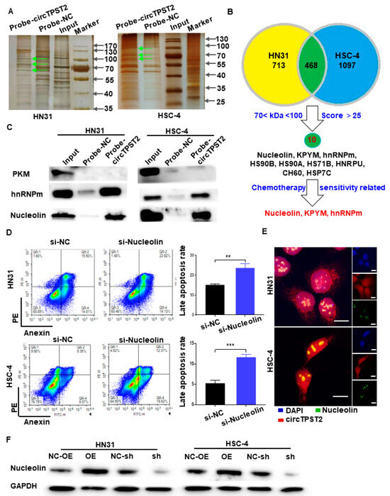 CircTPST2 could interact with the Nucleolin protein in HNSCC. (A) Different protein bands detected by silver staining for mass spectrometry of the circTPST2-protein complex pulled down by circTPST2 probe 2 in HN31 and HSC-4 cells. The arrow points to different protein bands. (B) Venn diagram showing the overlap of the target circTPST2-binding proteins in both HN31 and HSC-4 cells. (C) RNA pulldown and Western blot assays showing that hnRNPm and Nucleolin can interact with circTPST2 but not KPYM in HN31 and HSC-4 cells. (D) Flow cytometry assay was used to test the number of late apoptotic cells after the inhibition of Nucleolin expression in HN31 and HSC-4 cells. (E) RNA FISH showed colocalization of circTPST2 and miR-770-5p in HN31 and HSC-4 cells (scale bar, 100 μm). (F) Western blot showing the expression of Nucleolin in circTPST2 knockdown or circTPST2 overexpression HNSCC cell lines (Values are expressed as the mean ± SD; ** p < 0.01 and, *** p < 0.001). The uncropped bolts are shown in Supplementary Materials.