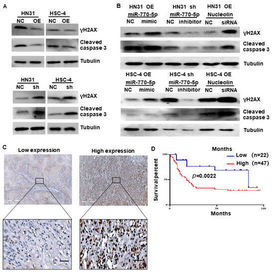 CircTPST2 regulates cisplatin sensitivity via a miR-770-5p and Nucleolin dual mechanism. (A) Western blot experiments showed the protein levels of γH2AX and cleaved caspase3 in circTPST2 knockdown and circTPST2 overexpression HNSCC cell lines after cisplatin treatment for 48 h. (B) Western blot experiments showed the protein levels of γH2AX and cleaved caspase3 in HNSCC cells with the addition of miR770-5p inhibitors or siRNAs targeting Nucleolin. (C) IHC staining of Nucleolin in an HNSCC clinical cohort, scale bar, 10 μm. (D) Kaplan–Meier analysis showed that Nucleolin was negatively correlated with the overall survival rate of HNSCC patients with chemotherapy according to our clinical cohort (Values are expressed as the mean ± SD; The uncropped bolts are shown in Supplementary Materials.