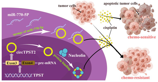 Molecular mechanism by which circTPST2 is involved in chemoresistance in HNSCC. CircTPST2 from exon 3 of TPST pre-mRNA could sponge-like bind to miR-770-5p and interact with Nucleolin to ultimately inhibit cisplatin sensitivity.
