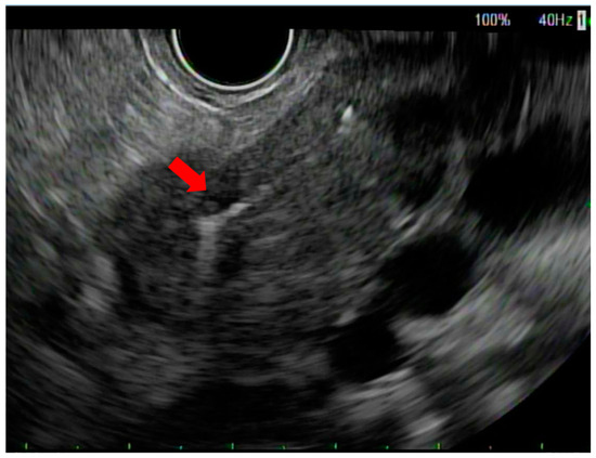 Endoscopic ultrasound view of fiducial marker in pancreatic neck tumor (red arrow).