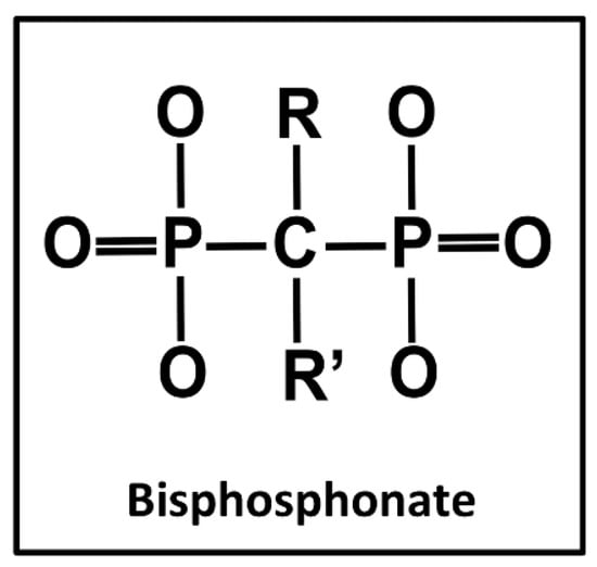 Chemical structure of bisphosphonates. The “R” and “R’” refers to long carbon chains that differ depending on the type of bisphosphonate.
