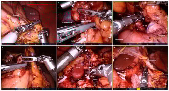 Images of a lymphadenectomy using the Vessel Sealer Extend® (Intuitive Surgical, Sunnyvale, CA, USA). (a) Lymphadenectomy in lymph node 4sb (GEA, gastro-epiploic arcade; LN, lymph node); the greater curvature side of the gastric fundus was cleared using VSE (second arm), with the stomach pulled using Cadiere forceps (first arm). (b) Lymphadenectomy in lymph node 6 (RGEA, right gastro–epiploic artery; RGEV, right gastro-epiploic vein); the right gastro–epiploic artery was divided using VSE (second arm), with the duodenum pulled cranially using Cardiere forceps (first arm). (c) Lymphadenectomy in lymph node 5 (CHA, common hepatic artery; RGA, right gastric artery); the right gastric artery was divided using VSE (second arm), with the duodenum pulled caudally using Cardiere forceps (first arm). (d) Lymphadenectomy in lymph node 8 (LN, lymph node; RGA, right gastric artery); the supra-pancreatic lymph node was dissected using VSE (second arm), with the left gastric pedicle pulled cranially using Cardiere forceps (first arm). (e) Lymphadenectomy in lymph node 7 (CHA, common hepatic artery; LGA, left gastric artery; RGA, right gastric artery; SA, splenic artery); the left gastric artery was divided using VSE (second arm), with the left gastric pedicle pulled cranially using Cardiere forceps (first arm). (f) Lymphadenectomy in lymph node 1 (LGA, left gastric artery); the lesser curvature side of the esophago–gastric junction was cleared using VSE (second arm), with the left lateral section of the liver pushed cranially using Cadiere forceps (first arm).