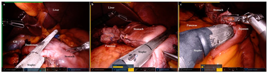 Images of robot-controlled surgical stapling. (a) The duodenum was divided using the robot-controlled surgical stapler (second arm) (GB, gall bladder). (b) The stomach was divided using the robot-controlled surgical stapler (second arm). (c) A gastro–jejunal anastomosis was performed using the robot-controlled surgical stapler (second arm).