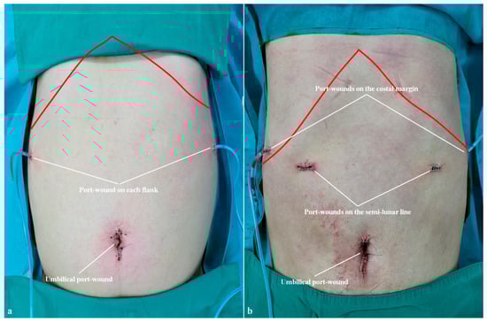 Port wounds on the abdomen. (a) Location of port wounds in a reduced-port robotic distal gastrectomy (red line indicates the costal margin). (b) Location of port wounds in a conventional laparoscopic distal gastrectomy (red line indicates the costal margin).