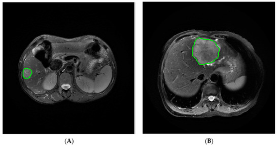 The MR images of the patients in the FS-T2WI and AP as well as PVP were exported in digital imaging and communications in medicine (DICOM) format and imported into IBEX software (β1.0, https://sourceforge.net/projects/ibex-mda/, accessed on 13 November 2021) for tumor image segmentation. Without knowing the pathological results, an observer with 6 years of experience in abdominal radiology used the IBEX software to delineate the region of interest (ROI) along the edge of the lesion that contained the tumor layer by layer, and the entire tumor volume was manually delineated (Figure 2). After segmenting the MR images, the gray-level run-length matrix (GLRLM), gray-level cooccurrence matrix (GLCM), intensity histogram and shape features were extracted and used to construct the FS-T2WI, AP and PVP datasets.