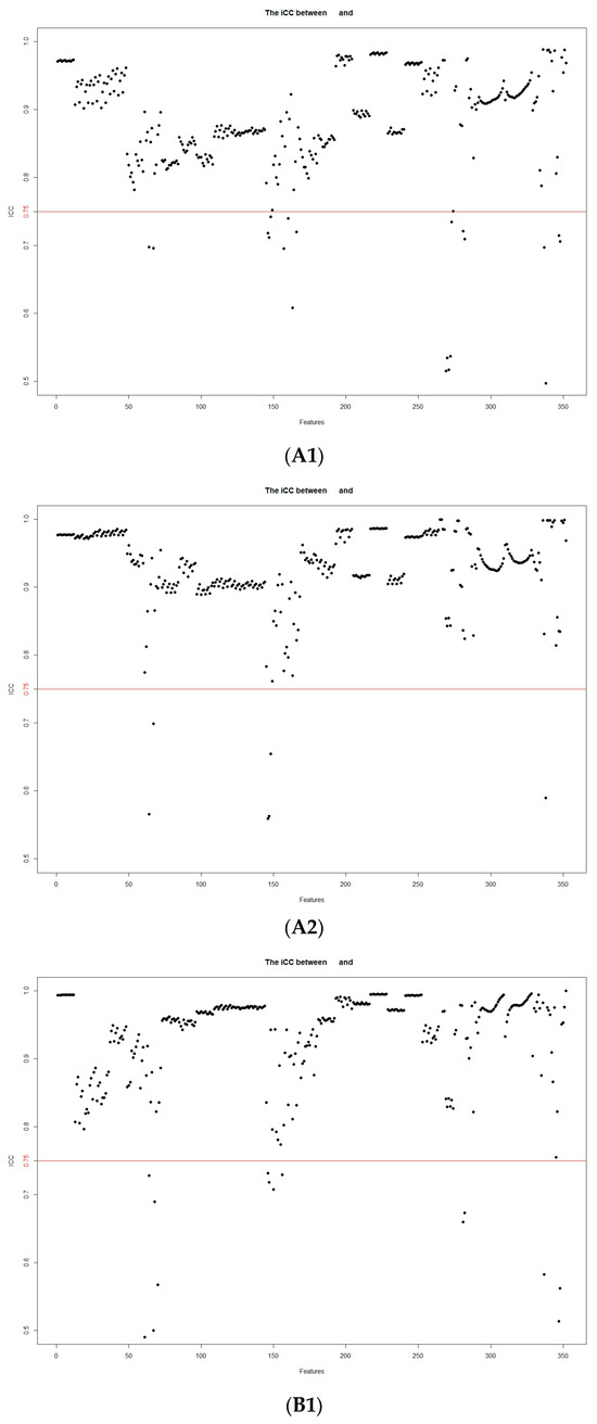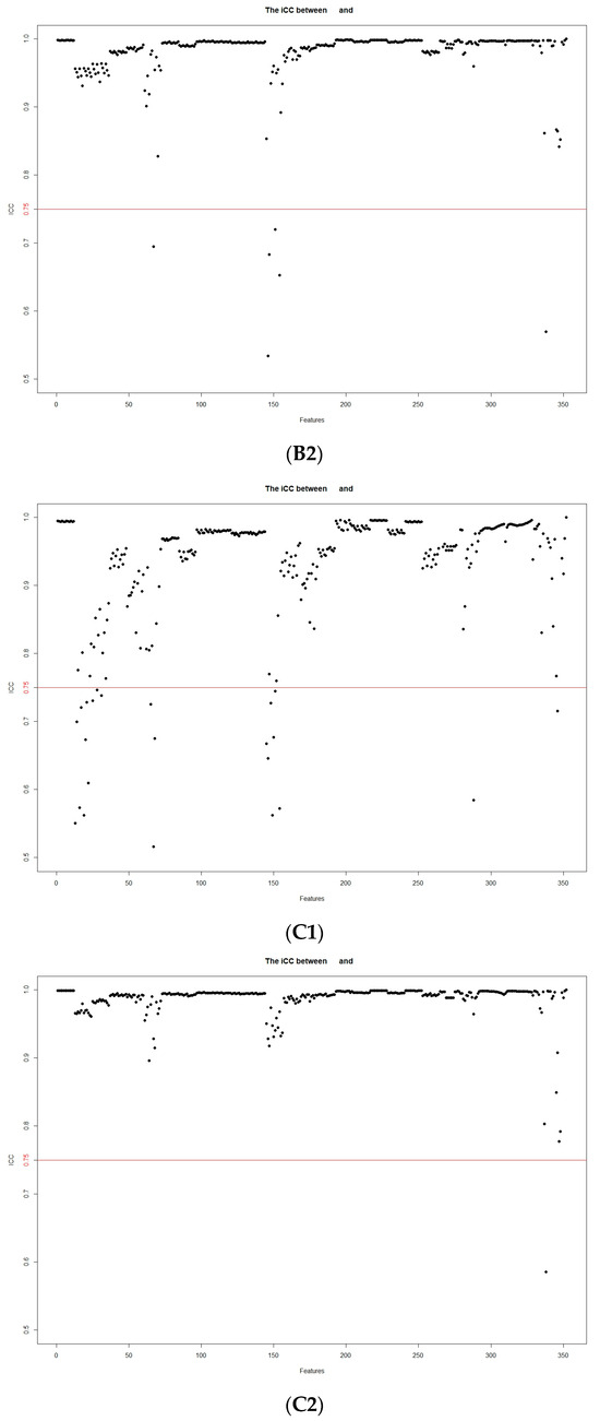 Stability assessment of the extracted MRI radiomic features according to inter- and intraobserver intraclass correlation coefficients: (A1) intergroup FS-T2WI; (A2) intragroup FS-T2WI; (B1) intergroup arterial phase; (B2) intragroup arterial phase; (C1) intergroup portal venous phase; (C2) intragroup portal venous phase.