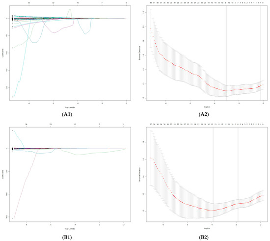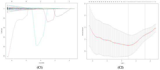 There were 327, 331 and 319 significantly different features in the FS-T2WI, AP and PVP datasets, respectively (p < 0.05), according to the independent-samples t test or Mann–Whitney U test. Finally, one, six and four optimal features, respectively, from these datasets were selected in LASSO regression (Figure 4 and Table 3).