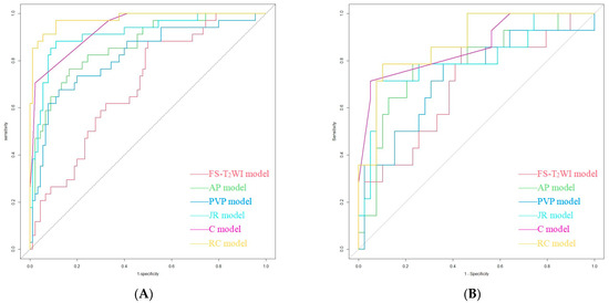 Performance of the FS-T2WI model, AP model, PVP model, JR model, C model and RC model in identifying HCC and ICC in the training group (A) and validation group (B) as detected using ROC curve analysis.