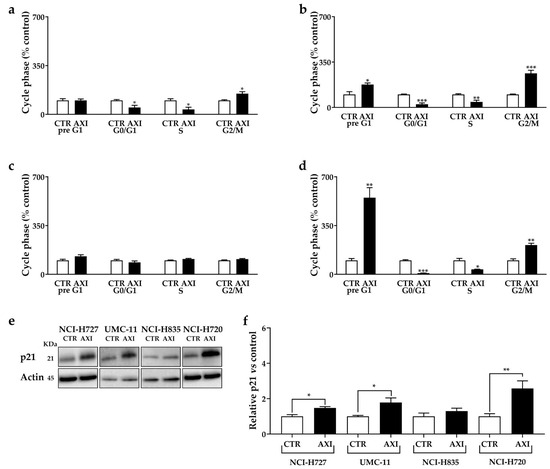 AXI significantly increased the percentage of human LC cells in pre-G1 phase (UMC-11: +76%, p < 0.05; NCI-H720: +450%, p < 0.01), while it decreased the percentage of cells in G0/G1 (NCI-H727: −50.8%, p < 0.05; UMC-11: −75.1%, p < 0.001; NCI-H720: −91.2%, p < 0.001) and in S phase (NCI-H727: −64.6%, p < 0.05; UMC-11: −57.1%, p < 0.01; NCI-H720: −64.1%, p < 0.05), with a concomitant increase in population in the G2/M phase (NCI-H727: +48.4%, p < 0.05; UMC-11: +162.9%, p < 0.001; NCI-H720: +109.8%, p < 0.01) compared to controls (Figure 2a–d).