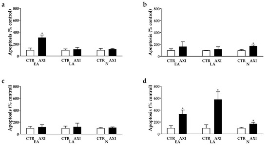 Cell death perturbation occurred in NCI-H727, UMC-11 and NCI-H720 cells after incubation with AXI compared with control. AXI increased the percentages of NCI-H727 (+271.5%, p < 0.05) and NCI-H720 (+366%, p < 0.05) cells in early apoptosis (Figure 3a,d, respectively) and the fraction of NCI-H720 cells in late apoptosis (+480%, p < 0.05, Figure 3d) compared to untreated control. In addition, this drug increased the number of UMC-11 (+74.7%, p < 0.05, Figure 3b) and NCI-H720 cells (+69.7%, p < 0.05, Figure 3d) in necrosis compared to the control. No statistically significant effects on apoptosis were observed in NCI-H835 cells after AXI treatments (Figure 3c).
