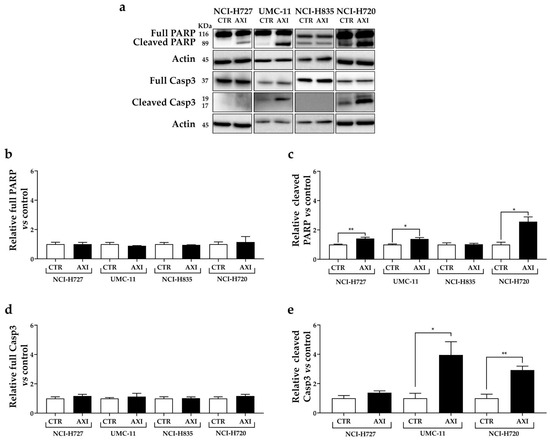 Interestingly, AXI increased the expression of cleaved PARP in all cell lines, except for NCI-H835, compared to untreated control (Figure 4a,c). Moreover, AXI treatment significantly induced the expression of cleaved caspase-3 in UMC-11 and NCI-H720 cell lines (Figure 4a,e). Otherwise, no statistically significant effects were observed in the expression level of full PARP and full caspase-3 after AXI treatment in all cell lines (Figure 4b,d).