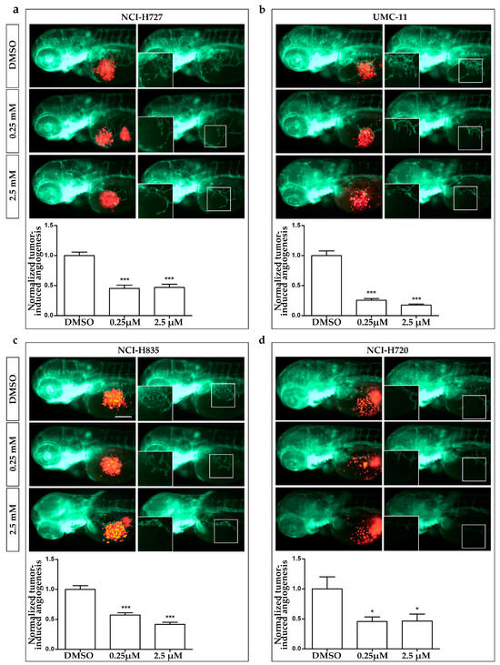 Effects of AXI treatments on tumor-induced angiogenesis in zebrafish embryos implanted with lung carcinoid cells. Representative epifluorescence images of Tg(fli1a:EGFP)y1 zebrafish embryos at 24 hpi, implanted with NCI-H727 (a), UMC-11 (b), NCI-H835 (c) and NCI-H720 (d) cells and treated with DMSO, as control, and 0.25 and 2.5 µM AXI. The red channel, corresponding to lung carcinoid cells, was omitted in the second column of each panel to highlight the tumor-induced microvascular network. Digital magnifications of graft regions are shown in white-boxed regions. Embryos are shown anterior to the left. Scale bar, 100 µm. In the bottom of each panel, the graph showed the quantification of tumor-induced angiogenesis in embryos implanted with lung carcinoid cells after 24 h of AXI treatment at 0.25 and 2.5 µM. Control (DMSO) values have been set to 1.0. Graphed values represent the mean ± S.E.M. * p < 0.05; *** p < 0.001.