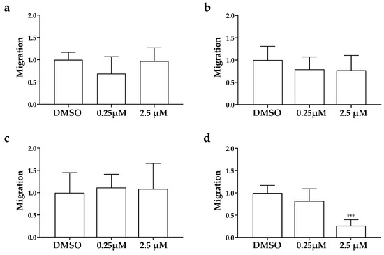 Effects of AXI on invasiveness of human LC cells in grafted zebrafish embryos. Quantification of cell spread in the tail of embryos injected with NCI-H727 (a), UMC-11 (b), NCI-H835 (c) and NCI-H720 (d) cells at 0 and 48 hpi after treatment with AXI (0.25 and 2.5 µM). As arbitrary unit of migration we considered the number of fluorescent particles in the tail. Graphed values represent the mean ± S.E.M. *** p < 0.001.