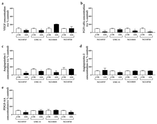 Following AXI treatment, a significant reduction in VEGF (Figure 7a) and Angiopoietin-2 concentrations (Figure 7d) was observed in conditioned medium from UMC-11 cells (−42.2% and −37.4%, respectively, both p < 0.05) compared to control. AXI also decreased FGF-1 secretion (Figure 7b) in two TC cell lines (NCI-H727: −79.4%, p < 0.001; NCI-H835: −54.7%, p < 0.05) and AT cell line (NCI-H720: −83.9%, p < 0.05). Concentrations of Angiopoietin-1 significantly decreased in conditioned medium from TC cell lines (NCI-H727: −67%, p < 0.001; UMC-11: −34.6%, p < 0.05; NCI-H835: −54.8%, p < 0.01) after incubation with AXI compared to control (Figure 7c), while PDGF-AA decreased in NCI-H727 and NCI-H720 cells (−44.3% and −40.3%, respectively, both p < 0.01, Figure 7e).