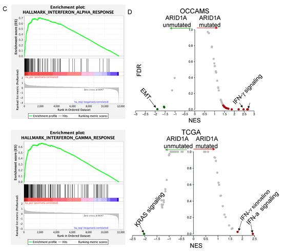 ARID1A mutations display increased tumor-infiltrating CD8+ T cells and IFN signaling pathways in EAC. (A,B) The statistical difference in tumor-infiltrating CD8+ T cells between mutated ARID1A and unmutated ARID1A in pan− cancer by (A) CIBERSORT− ABS and (B) XCELL. (C) The GSEA plot shows the positive enrichment of IFN-α and IFN-γ responses in the ARID1A knockdown cells compared to controls by shRNA in FLO1. (D) Volcano plots show GSEA results of the enriched IFN pathways in ARID1A-mutated compared to unmutated samples from OCCAMS and TCGA. Abbreviations: STAD: stomach adenocarcinoma, COAD: colon adenocarcinoma, READ: rectum adenocarcinoma, CHOL: cholangiocarcinoma, KIRC: kidney renal clear cell carcinoma, TGCT: testicular germ cell tumors, ACC: adrenocortical carcinoma, LUSC: lung squamous cell carcinoma, LUAD: lung adenocarcinoma, THCA: thyroid carcinoma, LAML: acute myeloid leukemia, BRCA: breast invasive carcinoma, OV: ovarian serous cystadenocarcinoma, PAAD: pancreatic adenocarcinoma, KIRP: kidney renal papillary cell carcinoma, GBM: glioblastoma multiforme, CESC: cervical squamous cell carcinoma and endocervical adenocarcinoma, LIHC: liver hepatocellular carcinoma, BLCA: bladder urothelial carcinoma, HNSC: head and neck squamous cell carcinoma, PRAD: prostate adenocarcinoma, SARC: sarcoma, SKCM: skin cutaneous melanoma, LGG: brain lower-grade glioma, DLBC: lymphoid neoplasm diffuse large B cell lymphoma, UCS: uterine carcinosarcoma, MESO: mesothelioma.