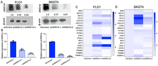 We next explored these associations by generating ARID1A knockdown EAC cells (FLO1, SKGT4) in vitro. The isogenic silencing of ARID1A in FLO1 and SKGT4 cells was verified by Western blotting and quantitative PCR (Figure 2A,B, Supplementary Figure S1). GSEA analysis of differentially expressed genes identified through RNA sequencing from ARID1A knockdown cells demonstrated the significant upregulation of the IFN-α and IFN-γ signaling pathways compared to the parental cells (Figure 1C), in agreement with EAC patient-derived data (Figure 1D). These data suggest that ARID1A mutation is associated with the IFN response pathway and may regulate the immune response in EAC cells.