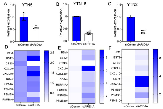 ARID1A knockdown induces IFN signaling response in murine EAC. (A–C) The mRNA expression level of ARID1A in ARID1A knockdown by siRNA in (A) YTN5, (B) YTN16 and (C) YTN2. (D,F) The expression of IFN signaling response-related genes in (D) YTN5, (E) YTN16 and (F) YTN2 transfected with ARID1A siRNA. n = 3. Paired, 2-tailed t test: ** p < 0.01, **** p < 0.0001. p values for (D,F) were determined by one-way ANOVA.