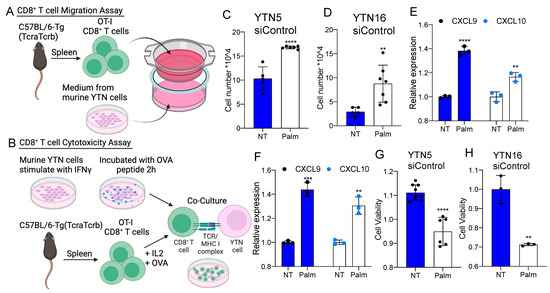 Palmitate potentiates CD8+ T cell recruitment and cytotoxicity in mouse EAC. (A) A diagram of CD8+ T cell migration assay. (B) A diagram of CD8+ T cell cytotoxicity co-culture assay. (C,D) The number of CD8+ T cells migrated into the culture medium from siControl of (C) YTN5 and (D) YTN16 with and without 48 h palmitate treatment. (E,F) The mRNA expression of CXCL9 and CXCL10 in siControl of (E) YTN5 and (F) YTN16 with and without 48 h palmitate treatment. (G,H) The cell viability of (G) YTN5 and (H) YTN16 siControl with and without palmitate treatment after CD8+ T cell cytotoxic killing for 24 h. n ≥ 3. Paired, 2-tailed t test: ** p < 0.01, *** p < 0.001, **** p < 0.0001.