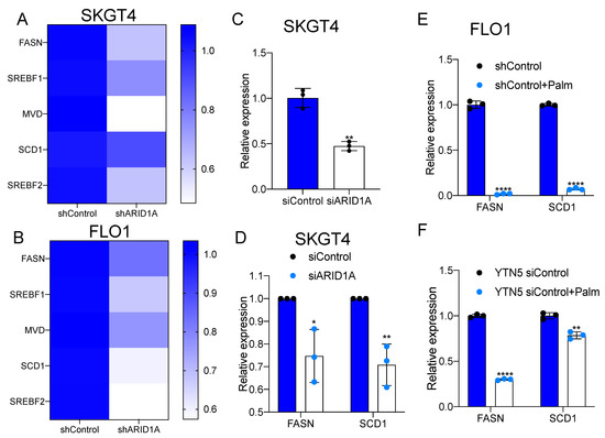 ARID1A knockdown inhibits de novo lipogenesis in EAC. (A,B) The expression of de novo lipogenesis-related genes in (A) SKGT4 and (B) FLO1 under ARID1A knockdown by shRNA. (C) The mRNA expression under ARID1A knockdown by siRNA in SKGT4. (D) The expression levels of FASN and SCD1 in SKGT4 transfected with ARID1A siRNA. (E,F) The mRNA expression of FASN and SCD1 in (E) FLO1 and (F) YTN5 control isogenic cells generated for ARID1A knockdown EAC treated with palmitate for 48 h. n = 3. Paired, 2-tailed t test: * p < 0.05, ** p < 0.01, **** p < 0.0001. p values for (A,B) were determined by one-way ANOVA.