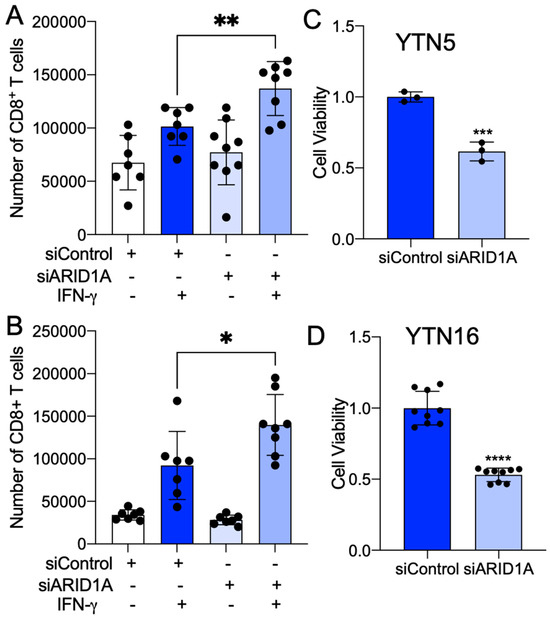 ARID1A knockdown promotes CD8+ T cell recruitment and cytotoxicity in mouse EAC. (A,B) The absorbance at 595 nm for the viable cells of (A) YTN5 and (B) YTN16 with and without ARID1A knockdown by siRNA after CD8+ T cell cytotoxic killing for 24 h. (C,D) The number of CD8+ T cells migrated into the culture medium from (C) YTN5 and (D) YTN16 with and without ARID1A knockdown by siRNA. n ≥ 3. Paired, 2-tailed t test: * p < 0.05, ** p < 0.01, *** p < 0.001, **** p < 0.0001.