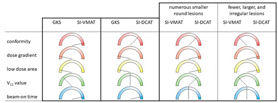 A relative comparison between the different treatment techniques; GK—Gamma Knife; SI-DCAT—single-isocenter dynamic arc therapy; SI-VMAT—single-isocenter volumetric arc therapy.