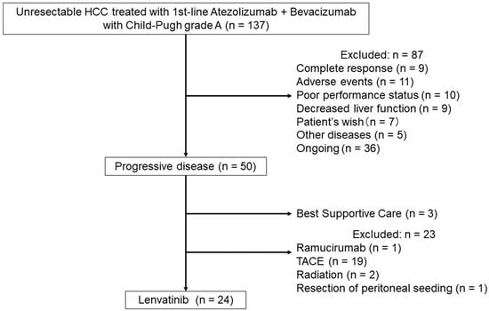 Yano, S.; Kawaoka, T.; Yamasaki, S.; Johira, Y.; Kosaka, M.; Shirane, Y.; Miura, R.; Amioka, K.; Naruto, K.; Yamaoka, K.; et al. Therapeutic Efficacy and Safety of Lenvatinib after Atezolizumab Plus Bevacizumab for Unresectable Hepatocellular Carcinoma. Cancers 2023, 15, 5406. https://doi.org/10.3390/cancers15225406