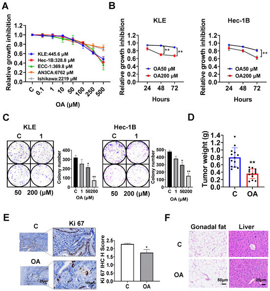 LKB1fl/flp53fl/fl mice were performed on the left uterine horn at six to eight weeks of age, to induce EC. The mice were further divided into the vehicle (same amount of BSA solution as OA group) or OA (10 mg/kg, daily, oral gavage, five days/week for four weeks) treatment groups at nine weeks of injection. Each group included 13 mice. The animals were weighed weekly throughout the study. All mice were euthanized after four weeks of OA or vehicle treatment. At sacrifice, endometrial tumors were weighed, and blood, liver, and intra-abdominal adipose tissue samples were taken. One-half of the endometrial tumors were snap-frozen and stored at −80 °C; the remaining one-half were fixed in 10% neutral-buffered formalin and paraffin-embedded.