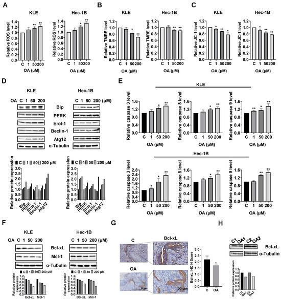 44]. Consistent with these results, our results showed that OA treatment at concentrations higher than 50 µM effectively increased intracellular ROS levels, decreased the levels of mitochondrial membrane potential, and upregulated the expression of Bip, PERK, Erol-1, Beclin-1, and Atg12 in EC cells. Meanwhile, OA at doses of 50 and 200 µM significantly increased cleaved caspase 3, 8, and 9 activities and decreased the expression of Bcl-xL and MCL-1, suggesting that intrinsic and extrinsic apoptotic pathways participate in OA-induced cell inhibition in EC cells. Thus, our data underline that OA-induced cellular stress and autophagy may be the triggers for apoptosis in EC cells.