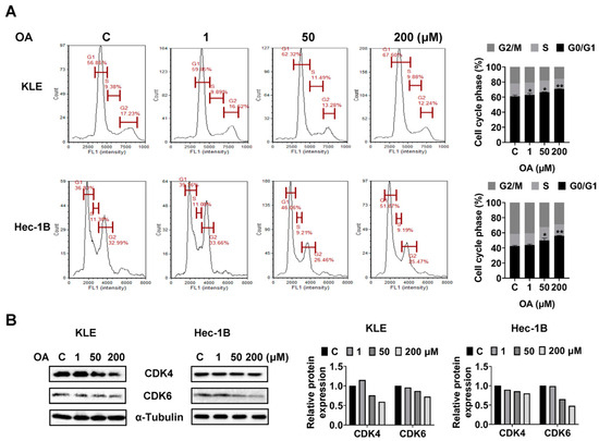 The KLE and Hec-1B cells were cultured in 6-well plates for 24 h and treated with OA (1, 50, 200 µM) for 36 h. The cells were harvested by 0.25% Trypsin (Sigma-Aldrich, St. Louis, MO, USA) and fixed in a 90% methanol solution for 1 h. The cells were resuspended in RNase A solution for 30 min, followed by incubation with propidium iodide (PI) staining solution for 10 min. All samples were immediately measured by Cellometer (Nexcelom, Lawrence, MA, USA) to assess cell cycle progression. The results were analyzed by FCS4 Express software (Molecular Devices, Sunnyvale, CA, USA).