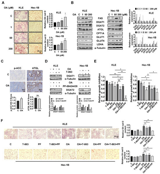 Figure 5A). Western blotting revealed that OA increased the expression of FAS, and the effect was more effective at a dose of 50 μM. In addition, increased expression of DGAT1 and DGAT2 and decreased expression of CPT1A and Glut1 were observed in both cell lines after 24 h of treatment. In KLE cells, OA at a dose of 200 μM also reduced the expression of ATGL, glucose transporter type 4 (Glut 4), and lactate dehydrogenase A (LDHA), while in Hec-1B cells, OA increased the expression of Glut4 and LDHA (