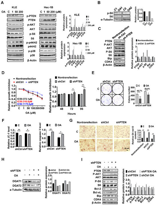 49]. By contrast, our results show that treatment of KLE and Hec-1B cells expressing wild-type PTEN with 1, 50, and 200 µM OA for 24 h significantly increased the expression of PTEN and decreased the expression of phosphorylated-PTEN, AKT, and S6 in both cell lines. Knockdown of PTEN in Hec-1B cells attenuated the cytotoxicity of OA and decreased TG synthesis and LD formation. Since PTEN mainly targets and dephosphorylates PIP3, which acts as a major passive regulator of PI3K/AKT signaling, we used the AKT inhibitor IPAT to inhibit the AKT/mTOR pathway to observe the effect of OA on cell growth, thereby further verifying the role of PTEN in the inhibition of cell growth by OA. As we expected, IPAT effectively restored the effects of OA on cell proliferation, apoptosis, and LA formation in both cell lines. Our results confirm that the status of PTEN and the activity of the AKT/mTOR pathway are key factors controlling the effect of OA on cell proliferation in wild-type PTEN EC cells. Functional PTEN is tightly regulated in cancer cells at the transcriptional, post-transcriptional, and post-translational levels, highlighting the complexity of the mechanisms underlying the effects of OA on PTEN expression in different types of cancer cells [