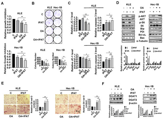 Figure 7E). To examine the effects of OA and IPAT on DGATs activity, the KLE and Hec-1B cells were treated with OA (200 μM), IPAT (20 μM), and OA combined with IPAT for 24 h. IPAT increased OA-induced expression of DGAT1 and DGAT2 in both cell lines (