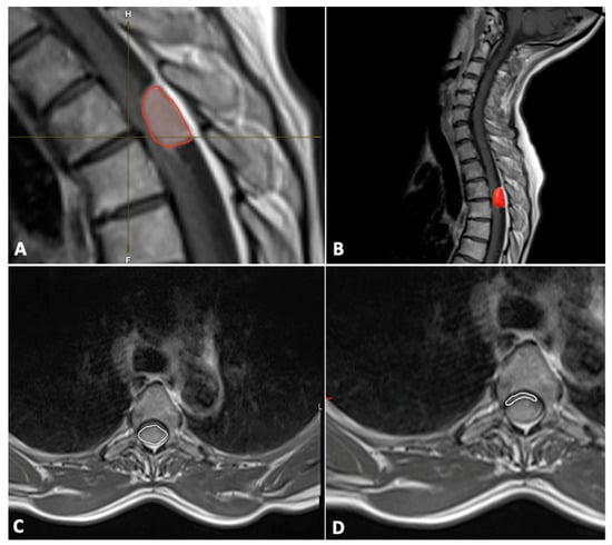 Tumor (red frame in the image) volume measurements with Brainlab Elements® version 3.1.0 (A,B); cross-section of spinal meningioma (C) and spinal cord (D).