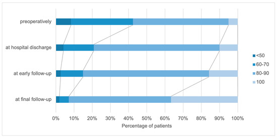 A similar trend was observed in the analysis of the McCormick and Frankel scales. The preoperative examinations resulted in an average McCormick scale value of 2.6. The mean McCormick scale value at hospital discharge was 2.09. Preoperatively, 11.7% of the patients were categorized as McCormick 1, 35.8% as McCormick 2, 39.2% as McCormick 3, 11.7% as McCormick 4, and 1.7% as McCormick 5. Postoperatively, 22.5% of the patients were categorized as McCormick 1, 52.5% as McCormick 2, 19.7% as McCormick 3, 5% as McCormick 4, and 0.8% as McCormick 5.