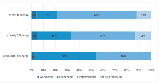 Distribution of patients based on the change in their neurological function at hospital discharge, at early and final follow-up.