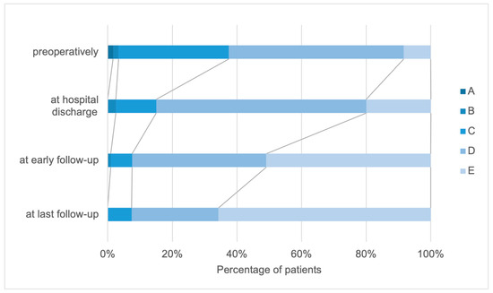 Distribution of patients according to the Frankel scale (A–E) preoperatively, at hospital discharge, and at early and final follow-up.